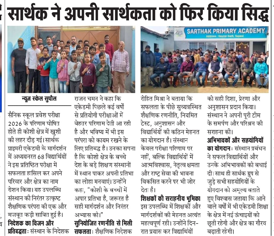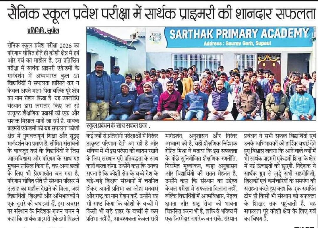 सार्थक प्राइमरी एकेडमी में 68 छात्रों ने AISSEE 2026 में ऐतिहासिक सफलता हासिल कर कोसी क्षेत्र को गौरवान्वित किया है |
